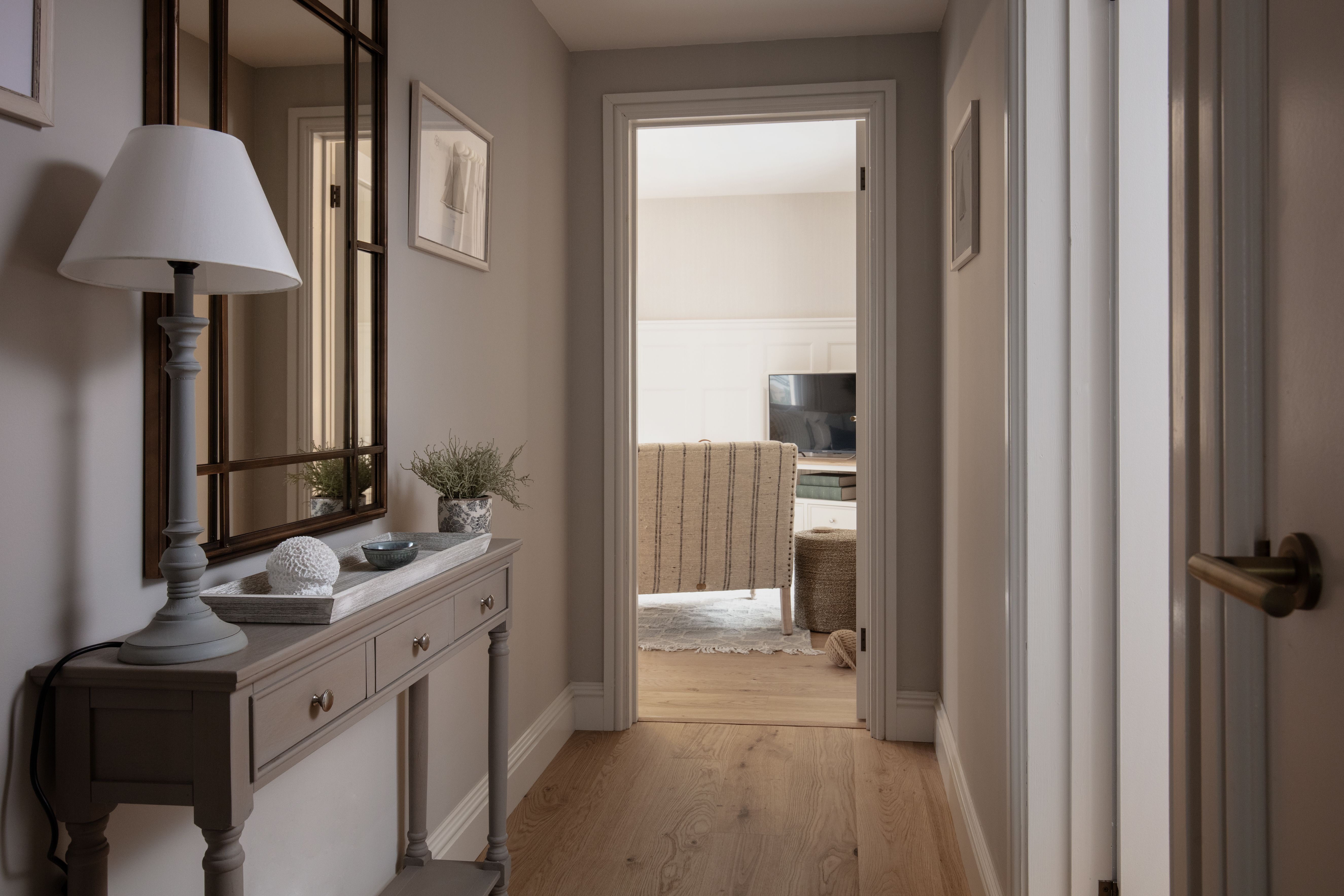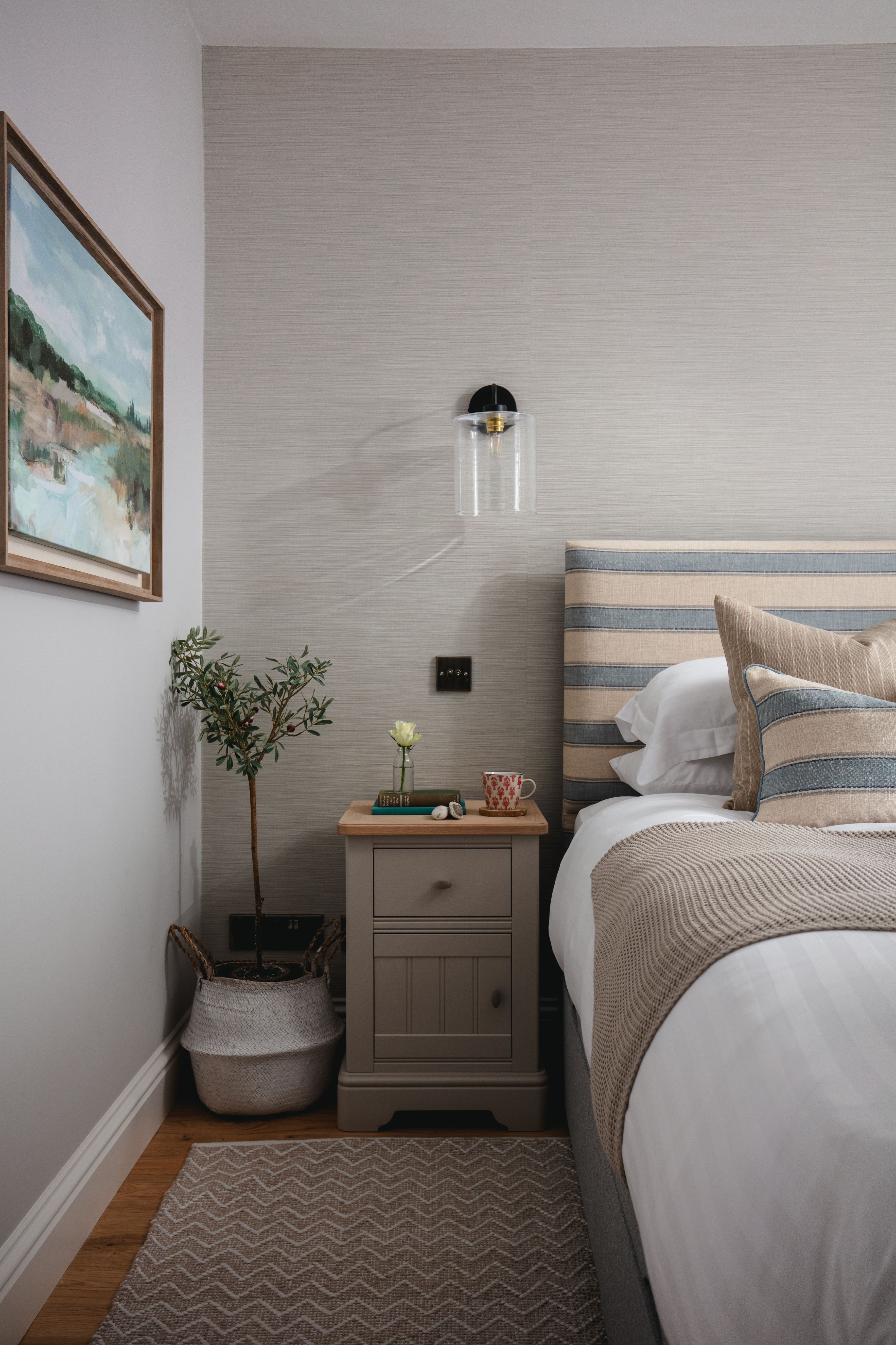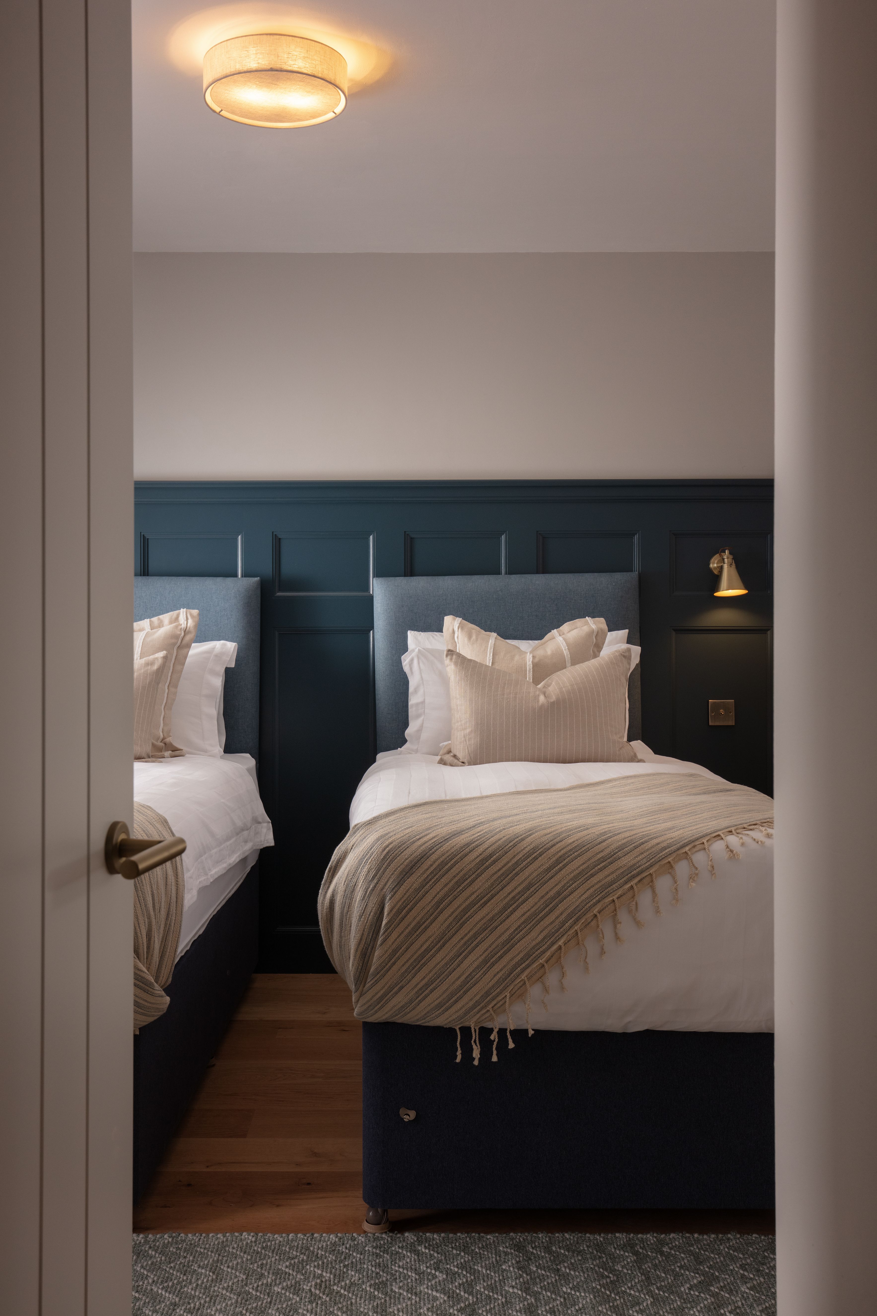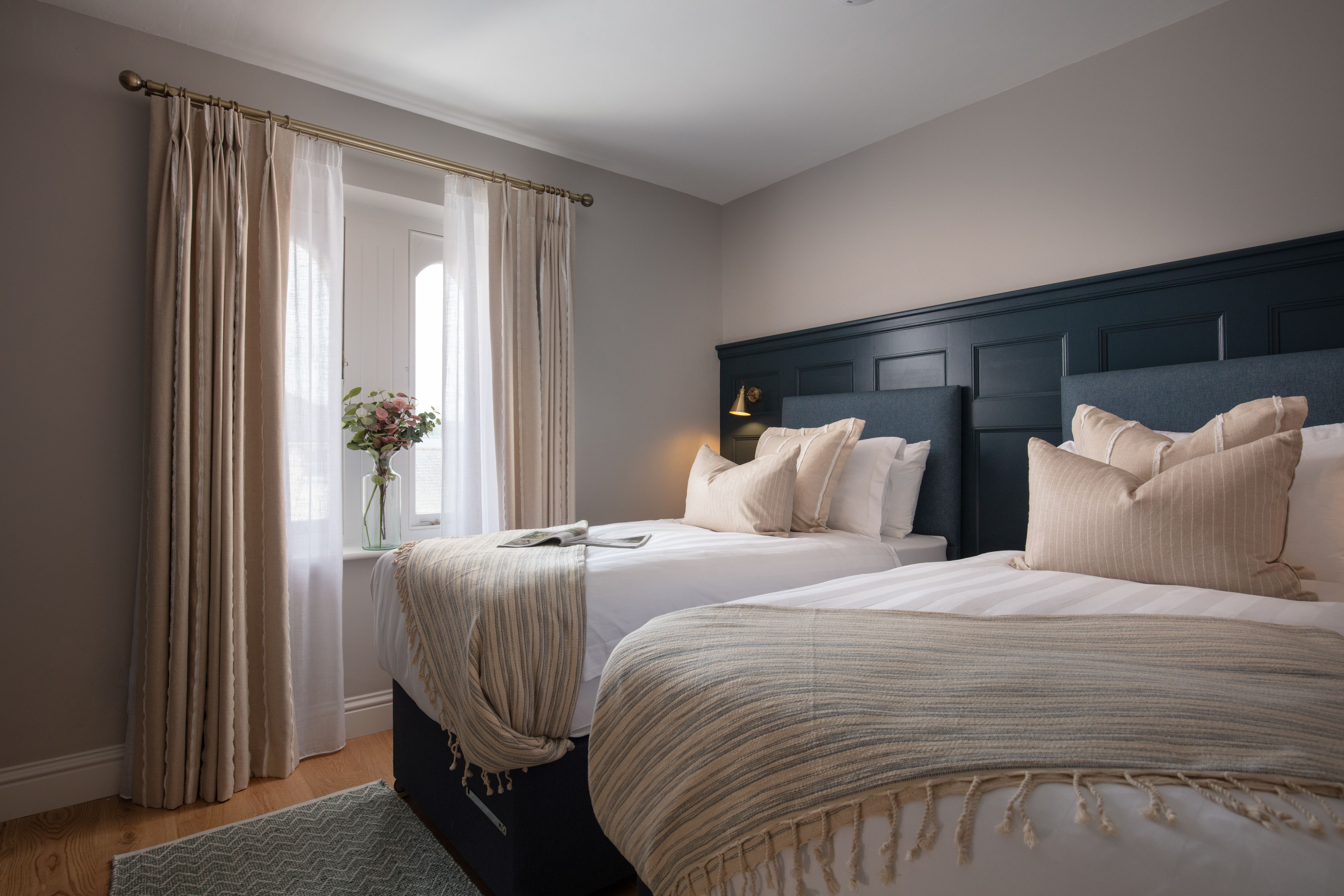Designed with a mix of New England and inspired by our coastal surroundings we wanted to create a relaxing and sumptuous atmosphere, with added luxury of wooden floors, bespoke wainscoting and textured wallpapers.