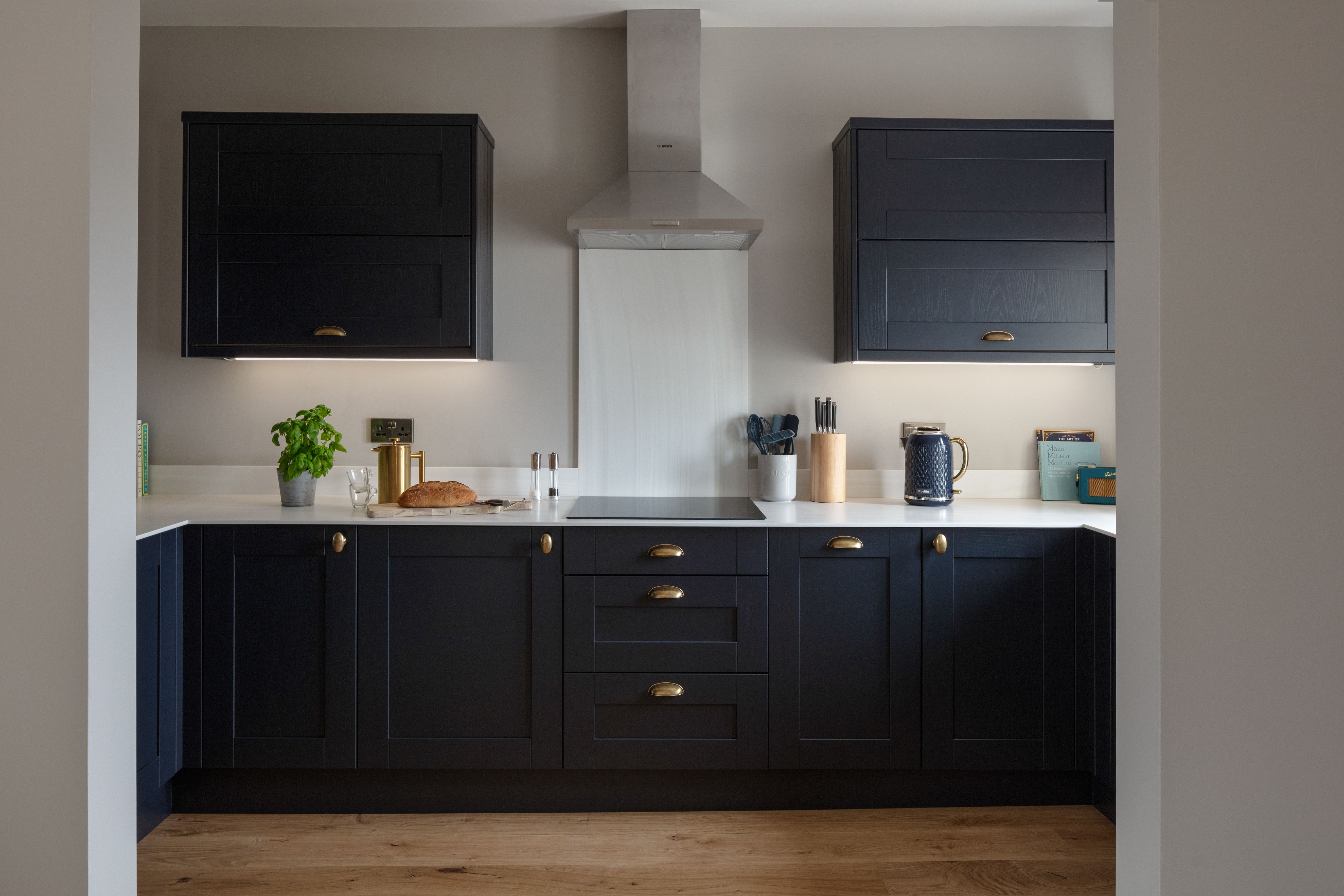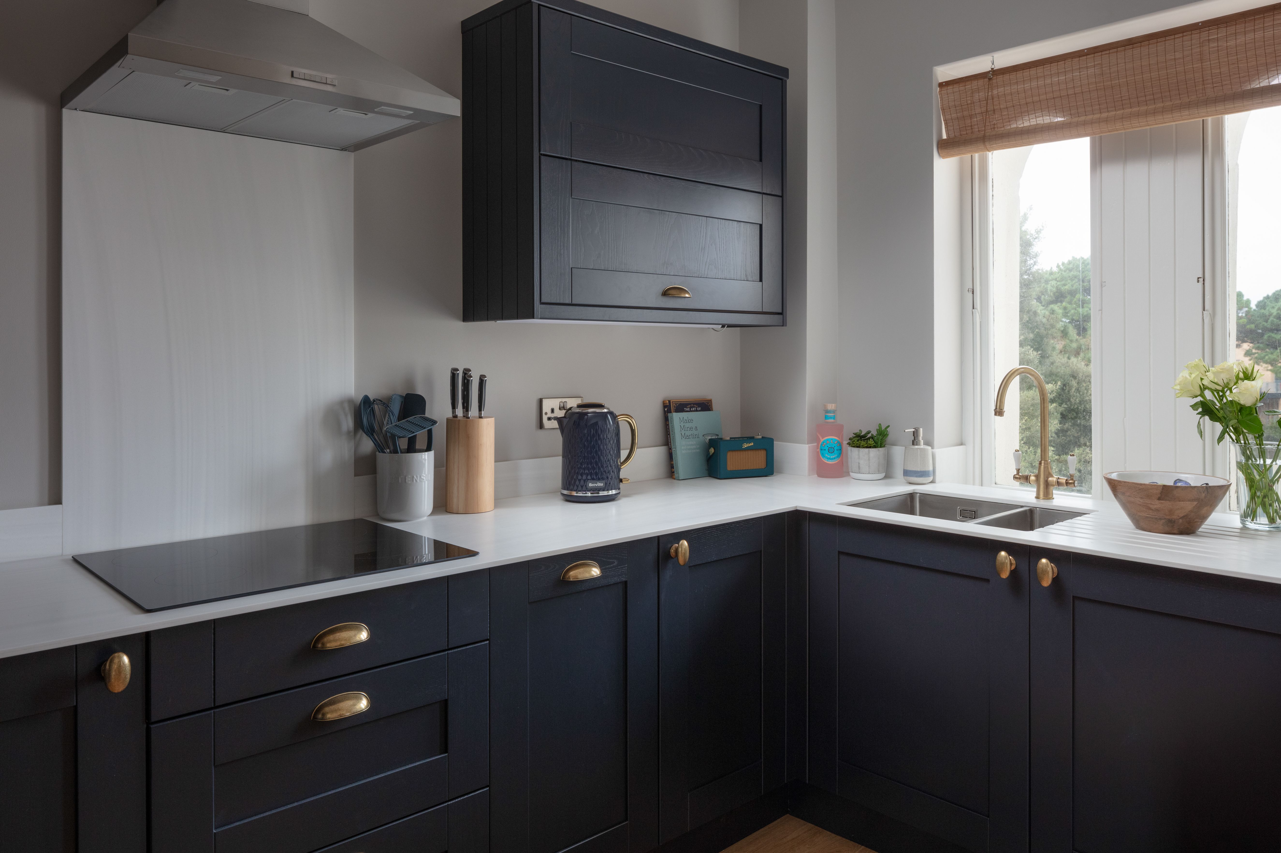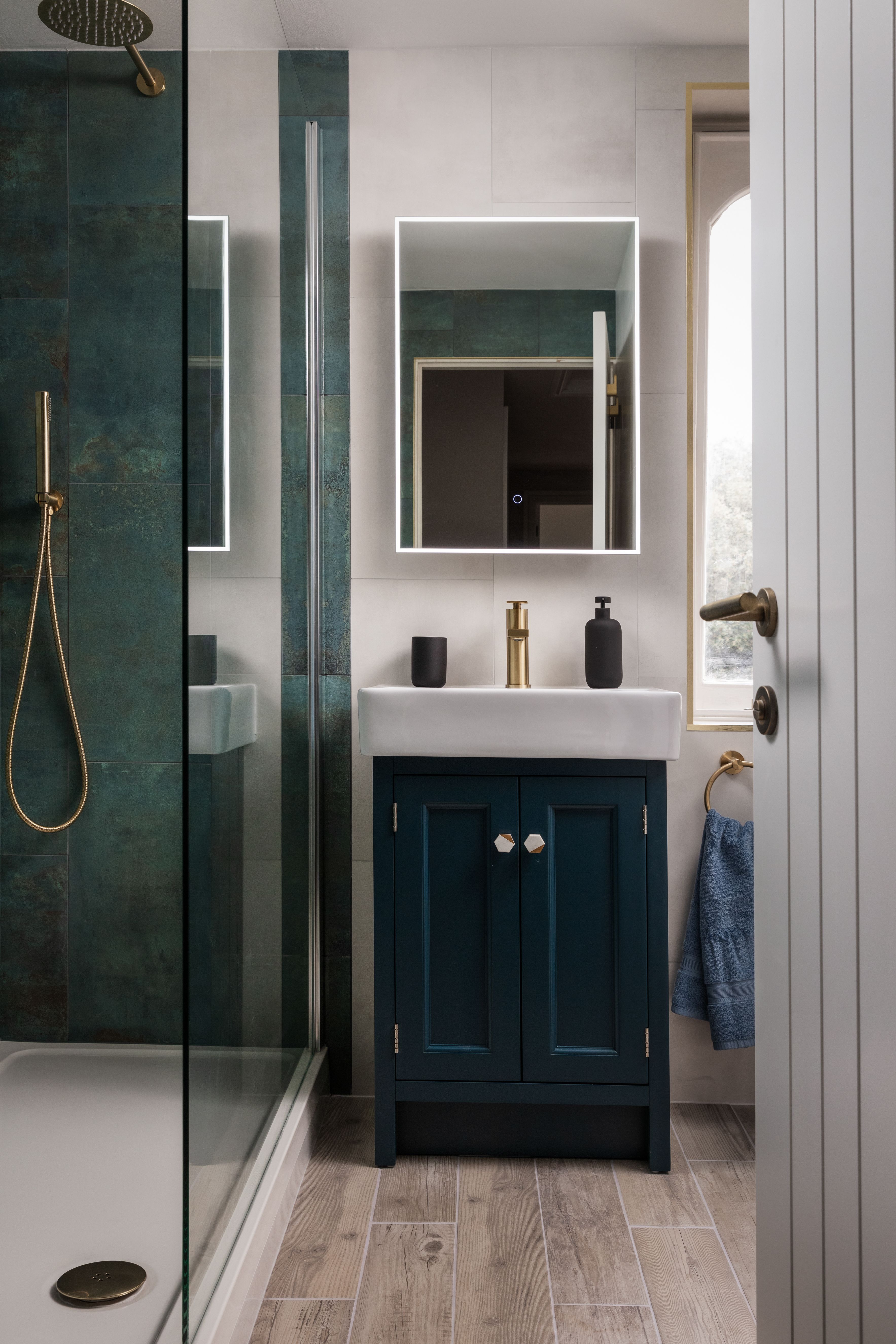 Both brand new kitchen and bathroom suites - with tones of the blue and brass fixtures to create cohesion throughout the apartment.
