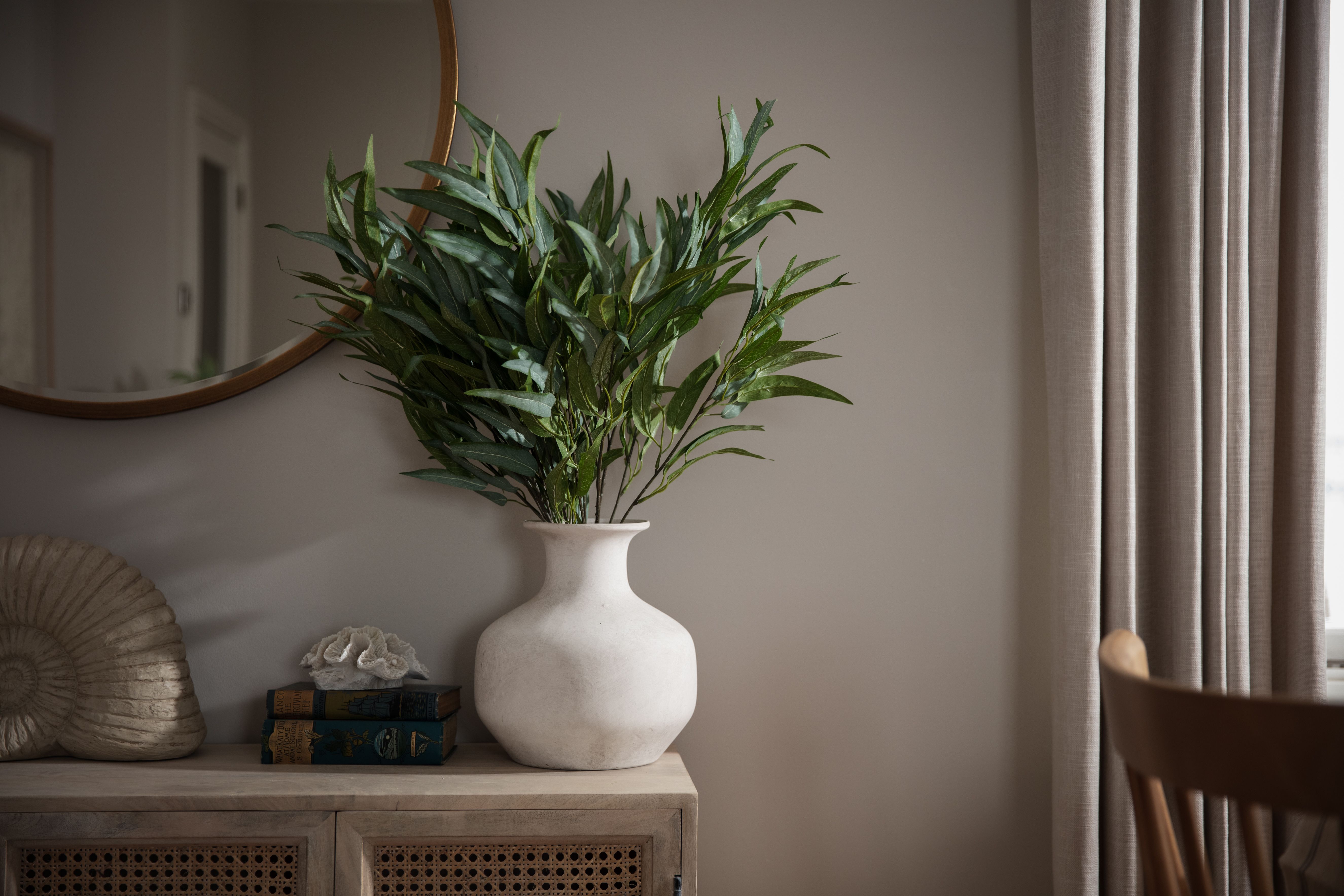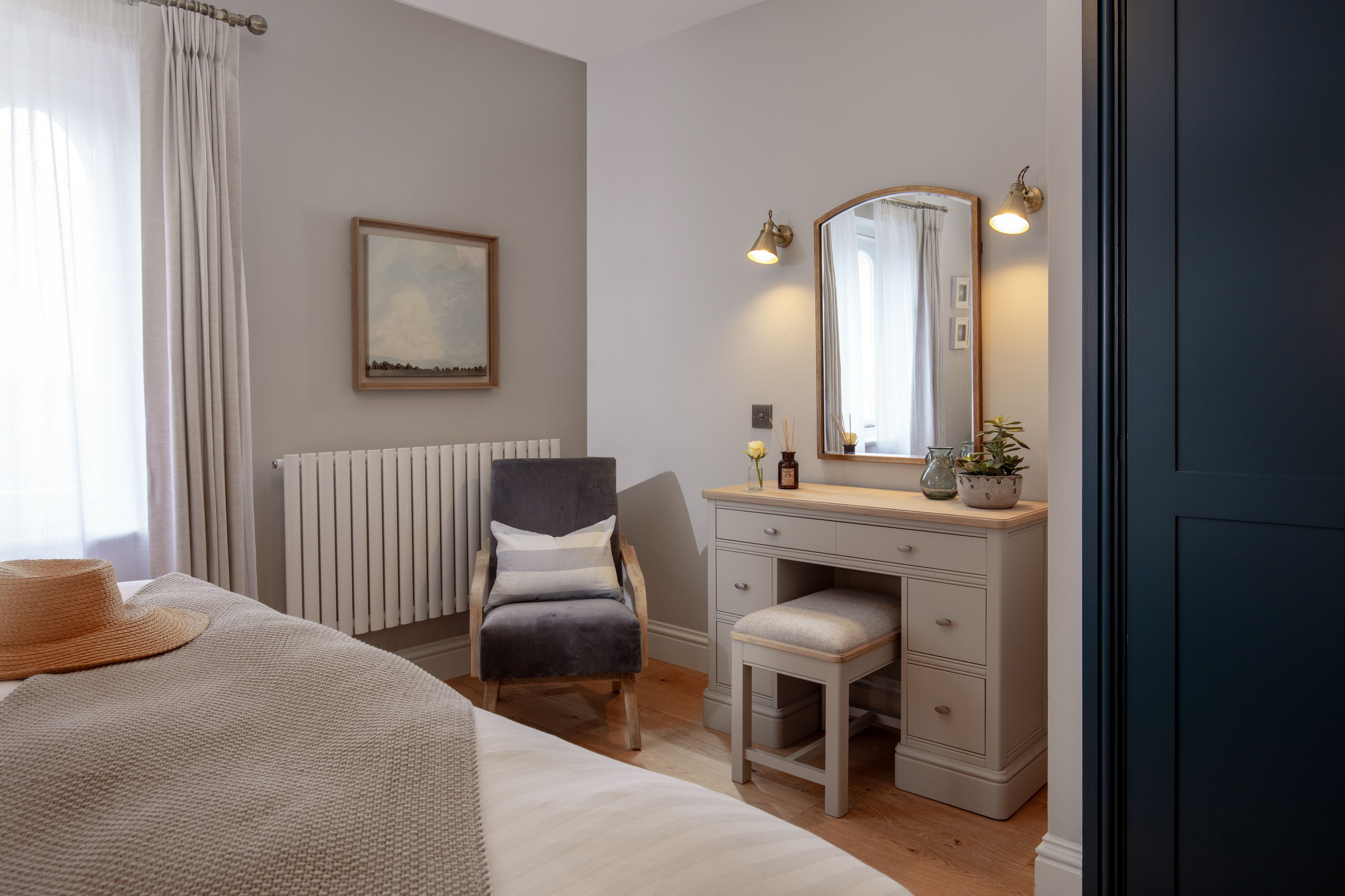 Mixing the dark blue with warm grey hues, we lightened the rooms and used simple voile fabric for a gentle underlay, complimented with a soft almond curtain.